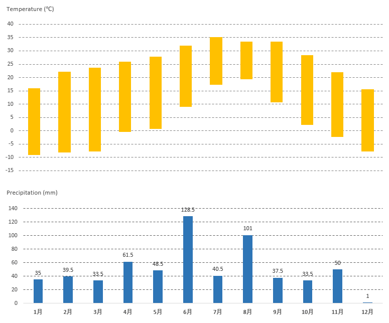 | Ave.(°C) | 1.5 | 2.8 | 4.3 | 12.4 | 15.2 | 18.4 | 24.7 | 24.2 | 21.9 | 15.6 | 9.1 | 1.9 |